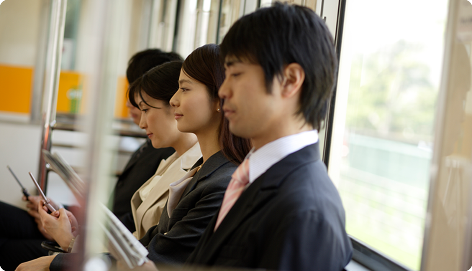 始発電車で座って通勤。