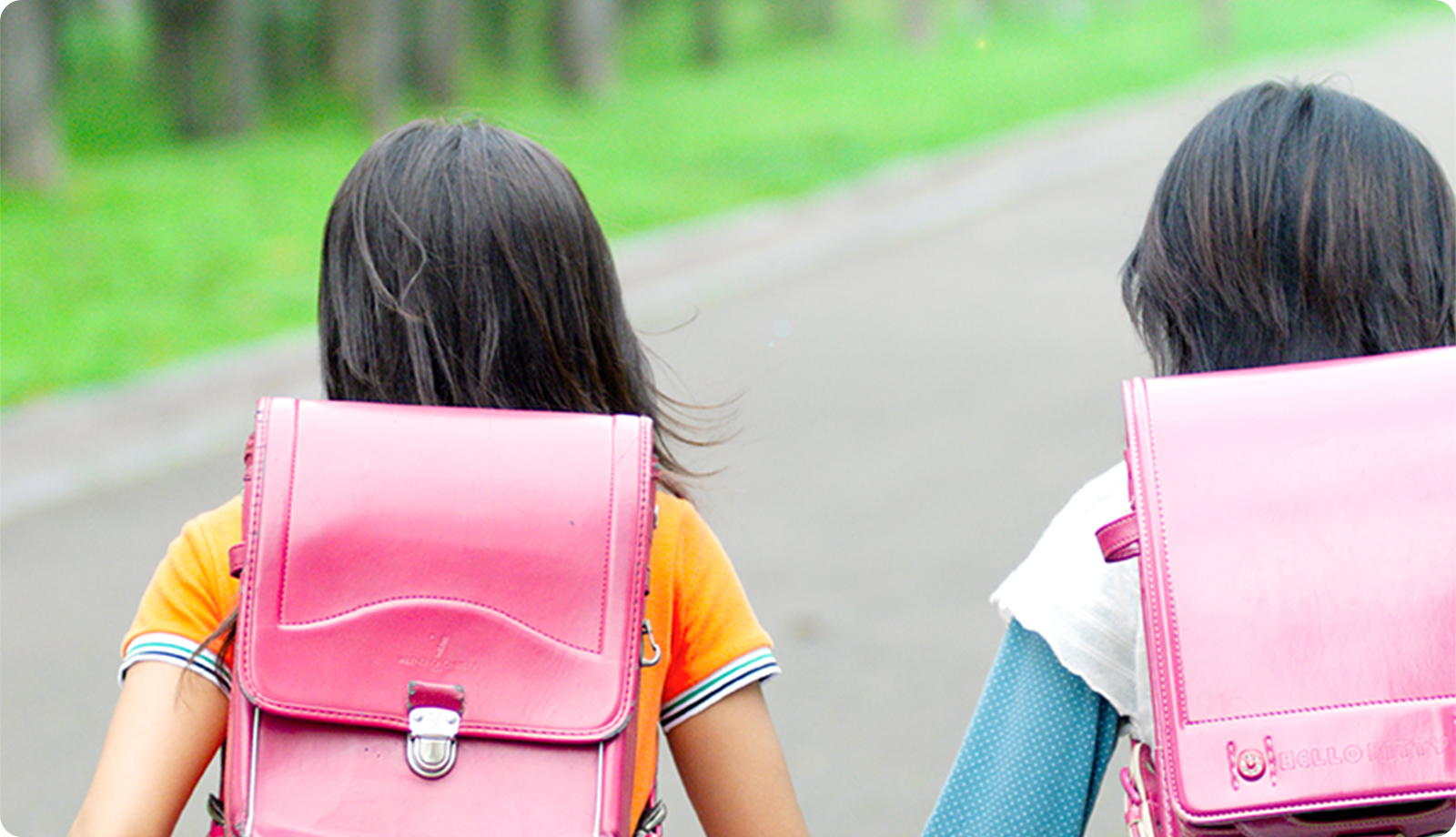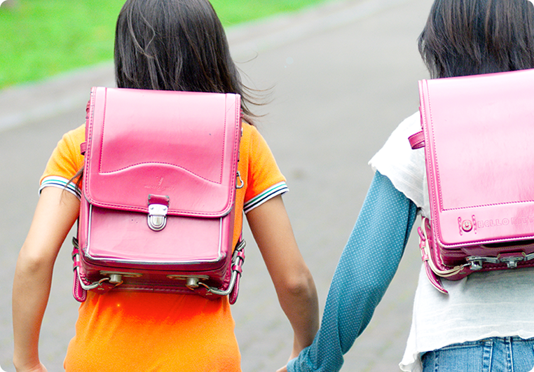 安全な通学路。今日も元気に学校へ。迎えに来てくれたお友達と一緒に学校へ。通学路はガードレールのある歩道を歩く一本道。おしゃべりしながら歩いているとパパ・ママが走って忘れ物の給食袋を持ってきてくれた。ゴメンねパパ・ママ、そしてありがとう。