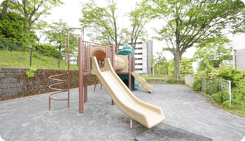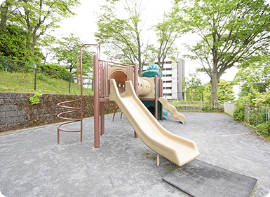 色んな遊具があって大満足。館ヶ丘団地にはAからNのエリアに14ヶ所の広場があるんだよ。滑り台やジャングルジム、ブランコ、鉄棒などの色んな遊具があって、毎日場所を変えて遊んでいるの。今日はどこで遊ぼうか?って、お友達と話してるだけでワクワクしちゃう!