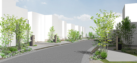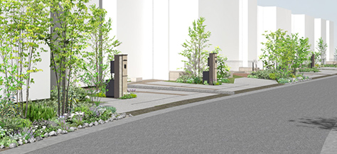 公園や緑道と連動してまちなみにリズムよく緑を配置。境界沿いに連続して緑が見えるよう構成しています。