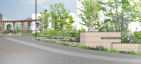 エントランスゲートとして街の顔となります。コミュニティの場として機能する公園と近接する緑豊かなエリアです。