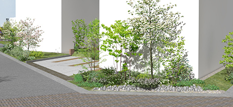 通りの結節点になる辻空間には自生種のコーナーツリーと低木で緑量ある演出を行います。